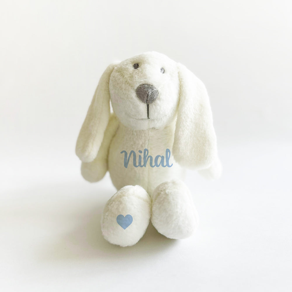 Please note: The colour of the bunny is white. The colour of the name is printed in blue.