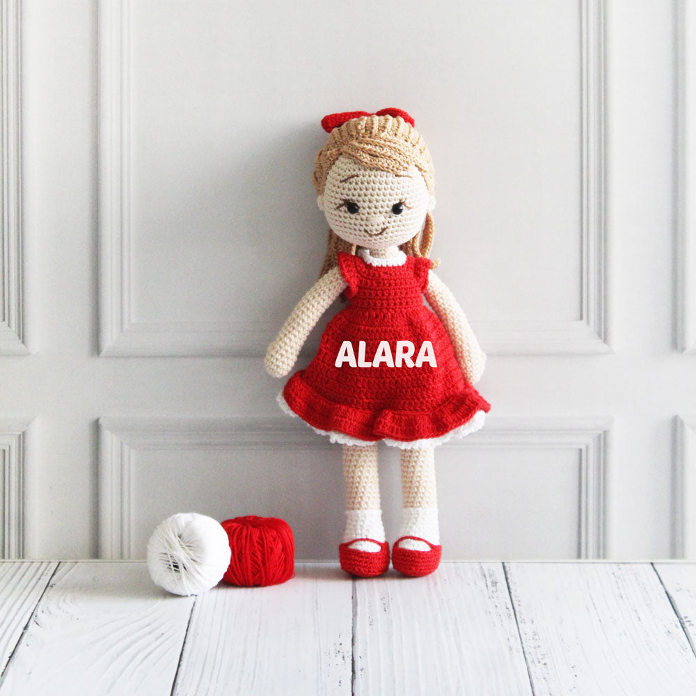2. Material: Cotton yarn/ Polyester Fibre filling /Plastic eyes & buttons. The name on the toy is printed.